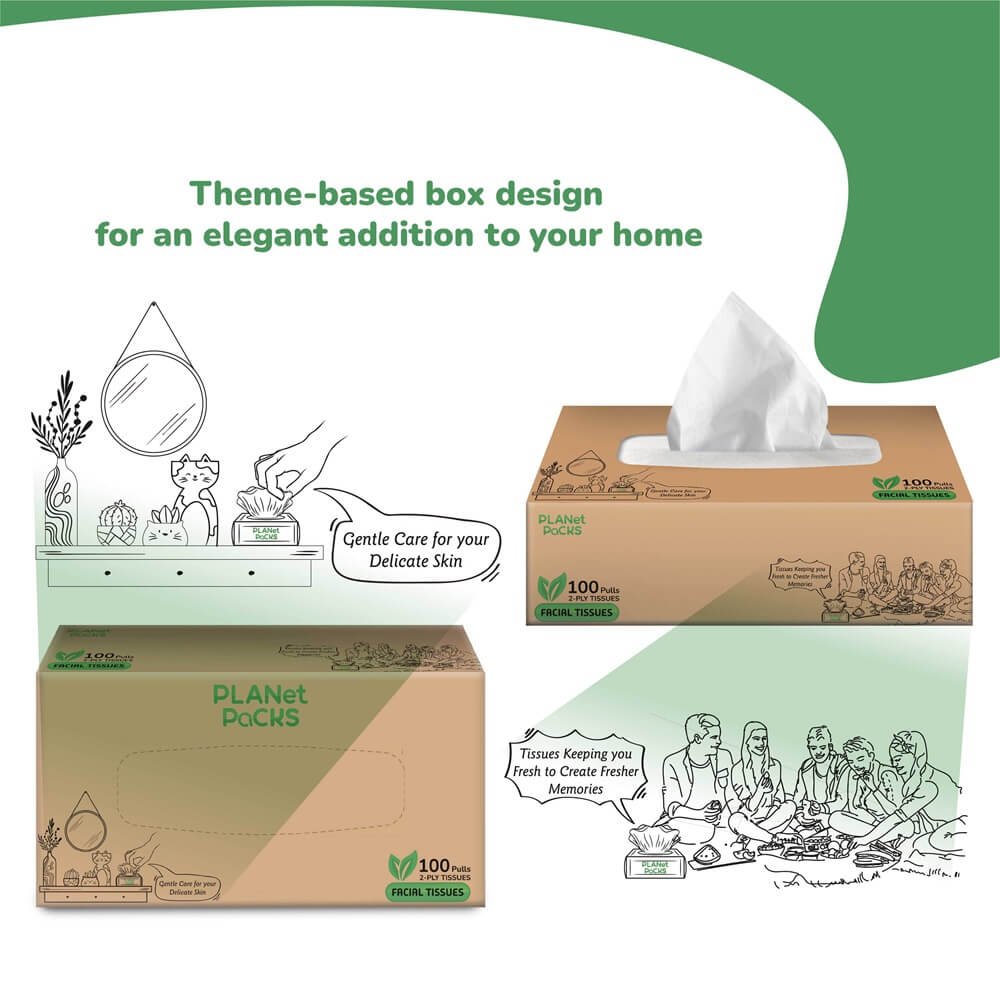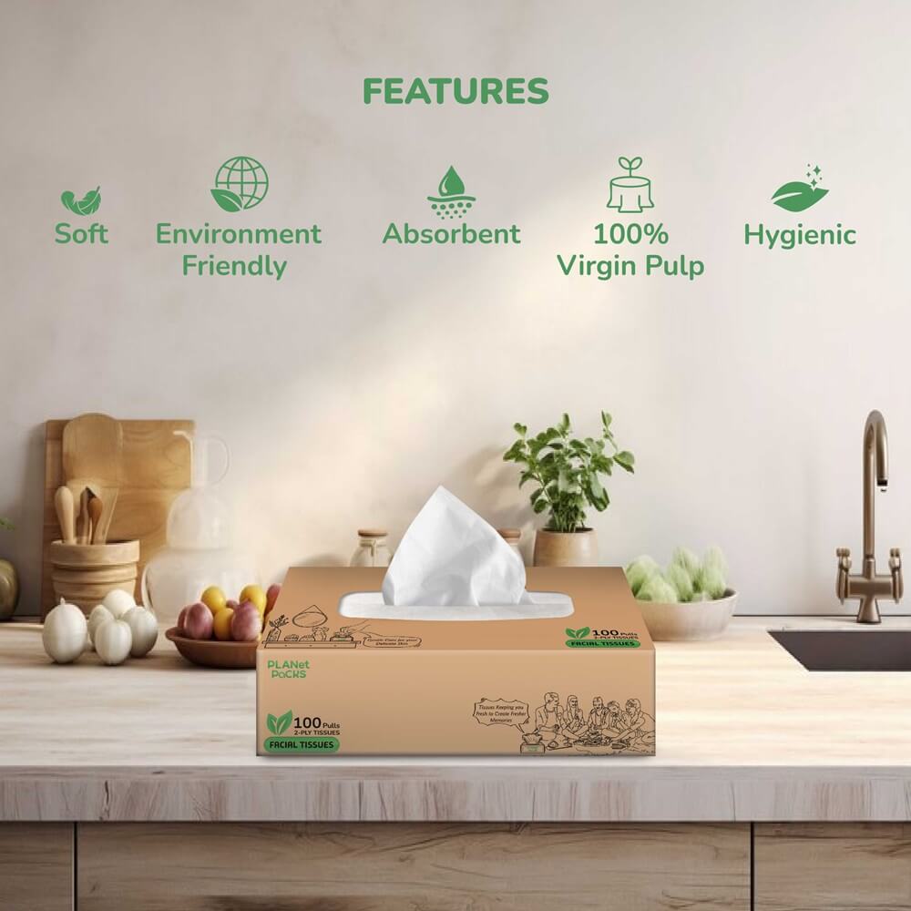 Planet Packs’ facial tissues offer an apt blend of strength and gentleness. Made from high-quality virgin pulp, these tissues are ideal for daily use, ensuring comfort and cleanliness in every wipe. Designed to be recyclable, they are both eco-friendly and durable. Whether in social gatherings, on the car dashboard, or in your bedroom, our facial tissues provide reliability and convenience wherever you need them.