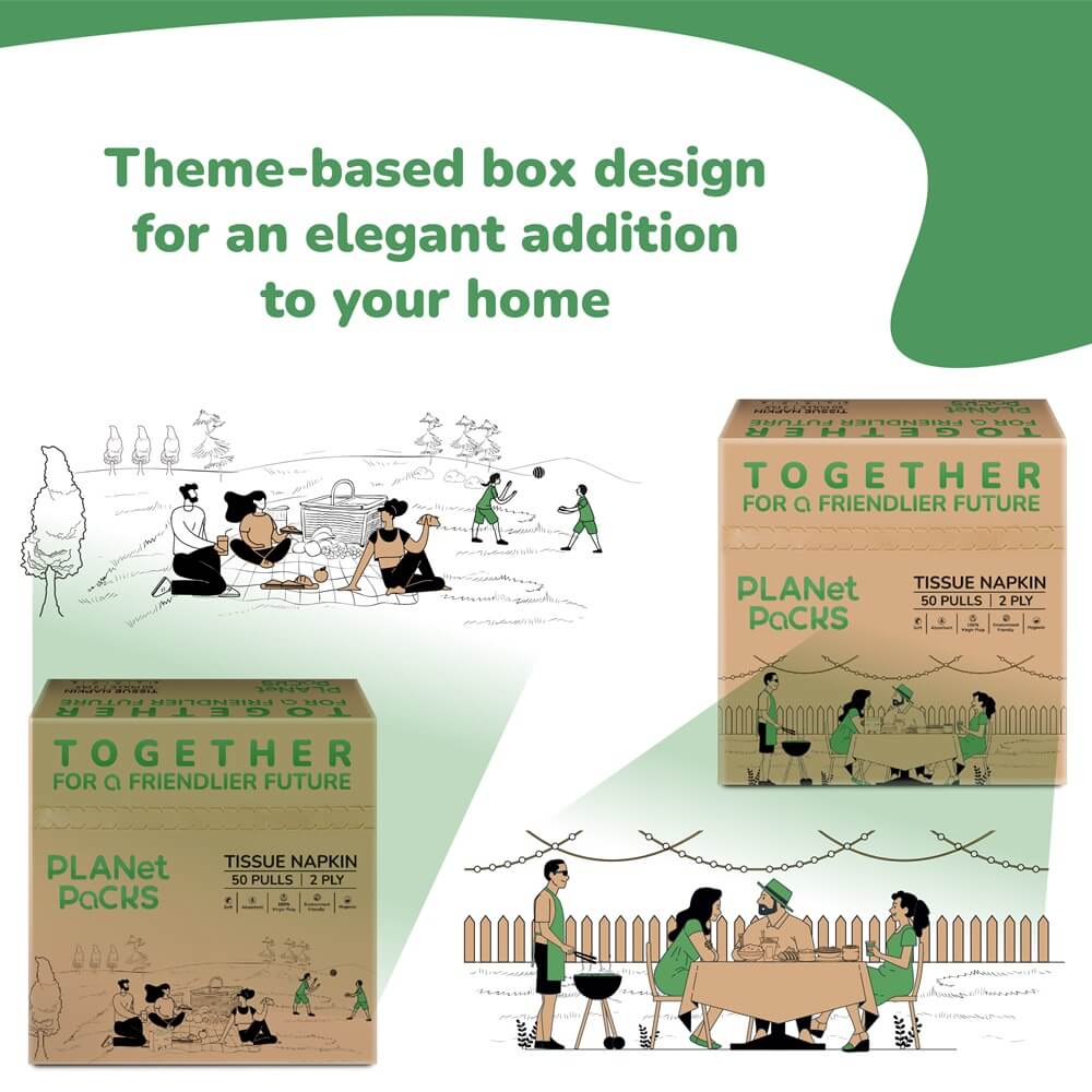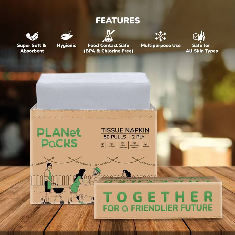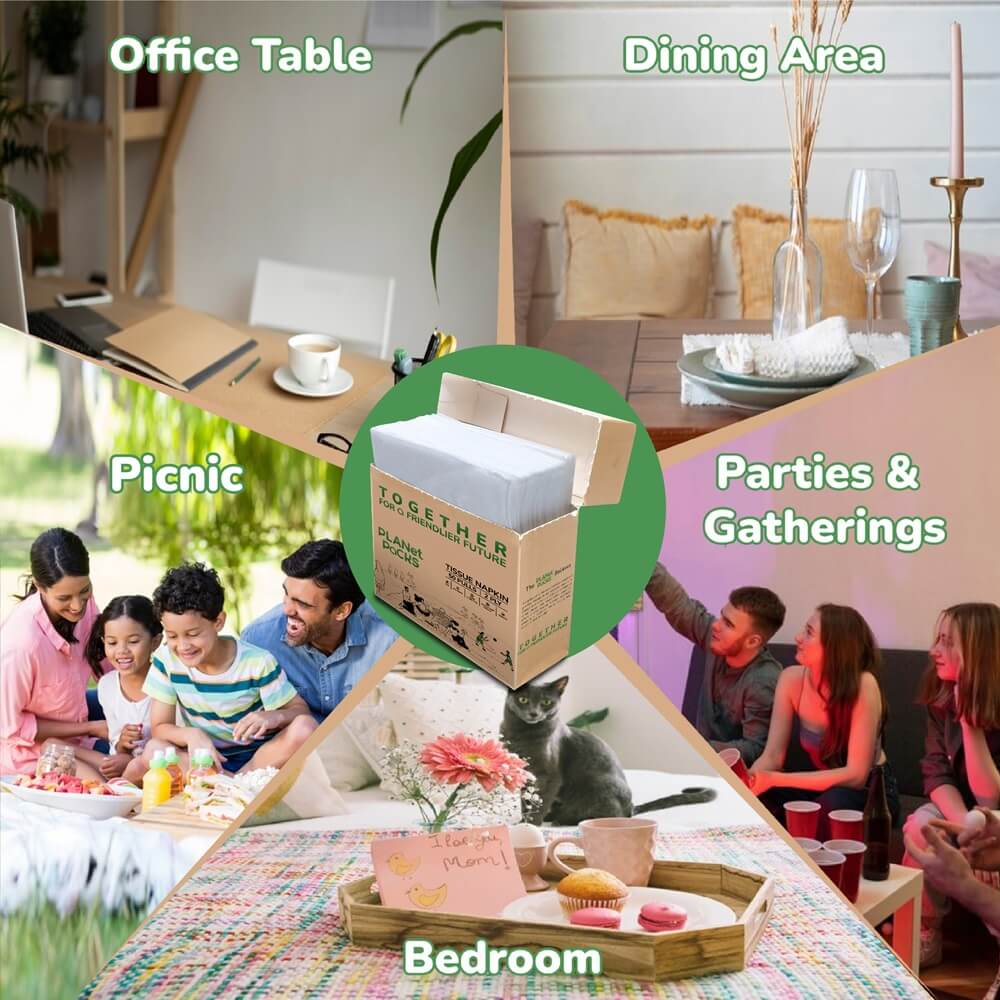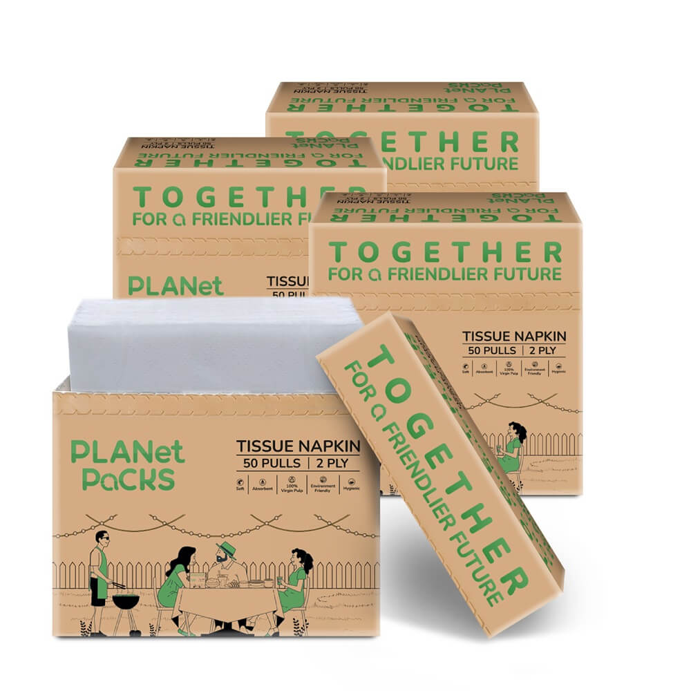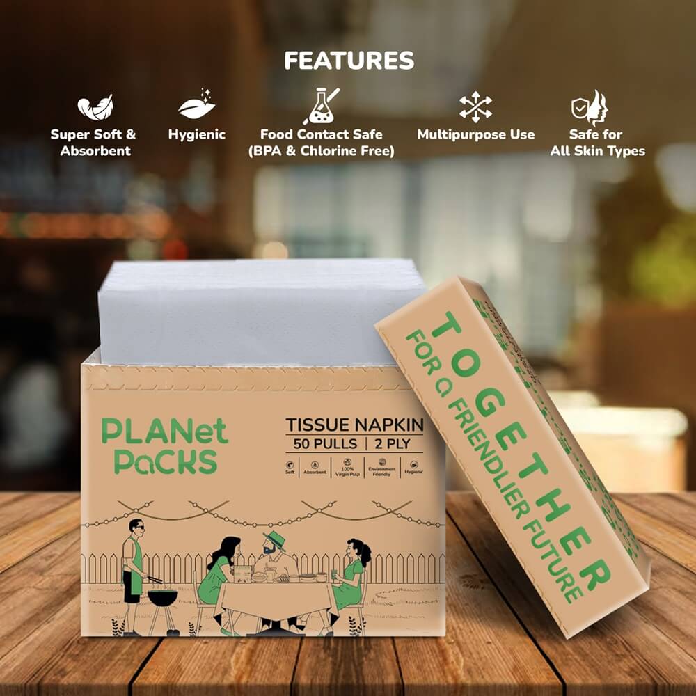 Our tissue napkins are crafted from premium virgin pulp, offering an extra soft and highly absorbent experience that’s gentle and safe for all skin types. Hygienic and recyclable, they’re designed to meet everyday needs with comfort and care. Ideal for use in bedrooms, kitchens, washrooms, and social gatherings, they bring convenience to every setting. Our product comes in application-based box packaging with zero plastic involvement, making it a sustainable choice. Whether at home or on special occasions, these tissue napkins combine functionality with eco-conscious living.